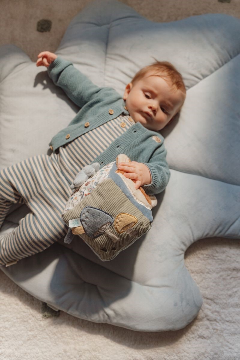 ¡Hay tanto para ver, tocar y oír! Cada día es una aventura con esta alfombra de juego con forma de hoja. Presentada en un suave tono azul, tiene dos arcos de pana con cinco peluches colgantes diferentes de la colección Forest Friends. El pequeño zorro, el búho sabio, el hongo amarillo y azul y la hoja ayudarán a desarrollar las habilidades sensoriales y la coordinación mano-ojo. ¡ADVERTENCIA! Coloque este juguete fuera del alcance del niño. Para evitar posibles lesiones por enredos, retire este juguete cuando el niño comience a intentar levantarse sobre sus manos y rodillas en posición de gateo. Requiere ensamblaje por parte de un adulto. Conserve esta información para referencia.
