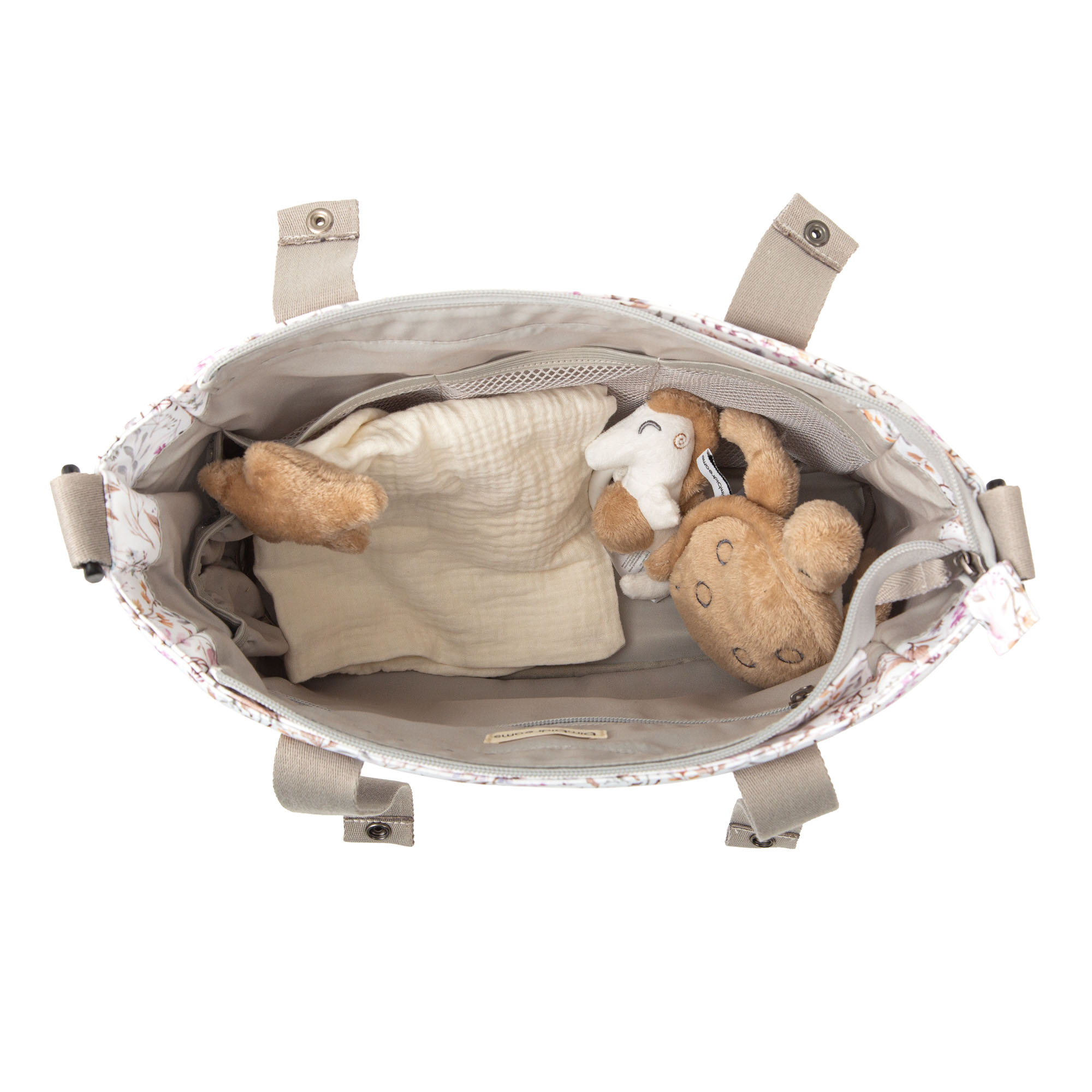 Bolso muy práctico para llevar lo necesario de tu bebé Incluye un cambiador que abierto mide 32 x 54 cm Dispone de asa larga y 2 asas cortas para colgar del manillar del cochecito Medidas: 37 x 24x 13 cm de hondo