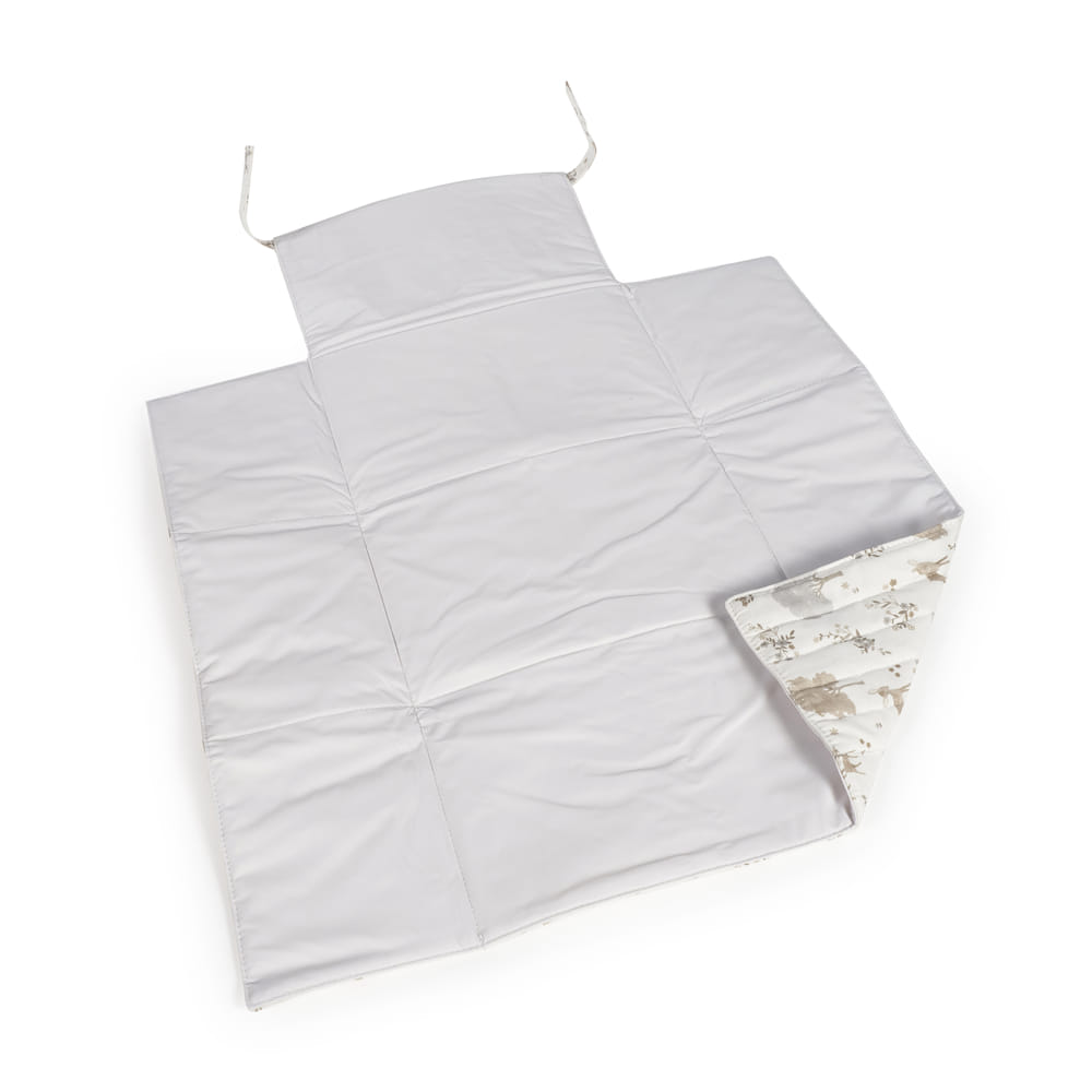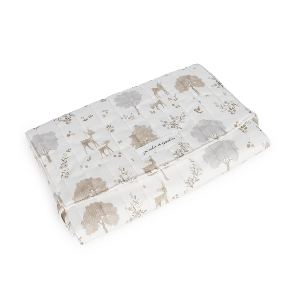 El cambiador para bebé Nara de Pasito a pasito elaborado elaborado en loneta de algodón 100% con un delicado estampado de ciervos y árboles en tonos neutros, es un modelo muy cómodo, práctico y fácil de transportar. Un patrón especialmente ideado para utilizarlo cuando necesites cambiar a tu bebé. Es plegable para facilitar su trasladarlo a todos lados. Es un diseño tan elegante como funcional, porque se presenta en formato plegado para hacerlo portátil. Cuenta con cintas de agarre de cierre para mantener el cambiador cerrado y así se reduce su espacio para llevarlo dentro de la bolsa de maternidad. Acabados de calidad. El cambiador de bebé cuenta con un forro interior acolchado e impermeable para hacerlo más fácil de limpiar una vez termines de usarlo y así evitar que se acumulen olores en el interior. Está fabricado con materiales de gran calidad, libres de colorantes azoicos, ftalatos y sustancias nocivas para la salud. Además se puede lavar a mano o a máquina a temperaturas de hasta 30º. Los productos para bebé de Pasito a Pasito cuentan con un diseño muy diferente a todos los demás; gracias a sus colecciones más trabajadas, caprichosas y a la vez prácticas, que utilizan materiales de primera calidad para remarcar la elegancia y la armonía en cada una de sus piezas. Nuestros modelos son exclusivos y de estilo inconfundible, pensados en madres actuales que gozan de buen gusto y que aprecian los detalles tanto como nosotros. Especificaciones: Materiales: 100% algodón. Medidas: 50×70 cm.
