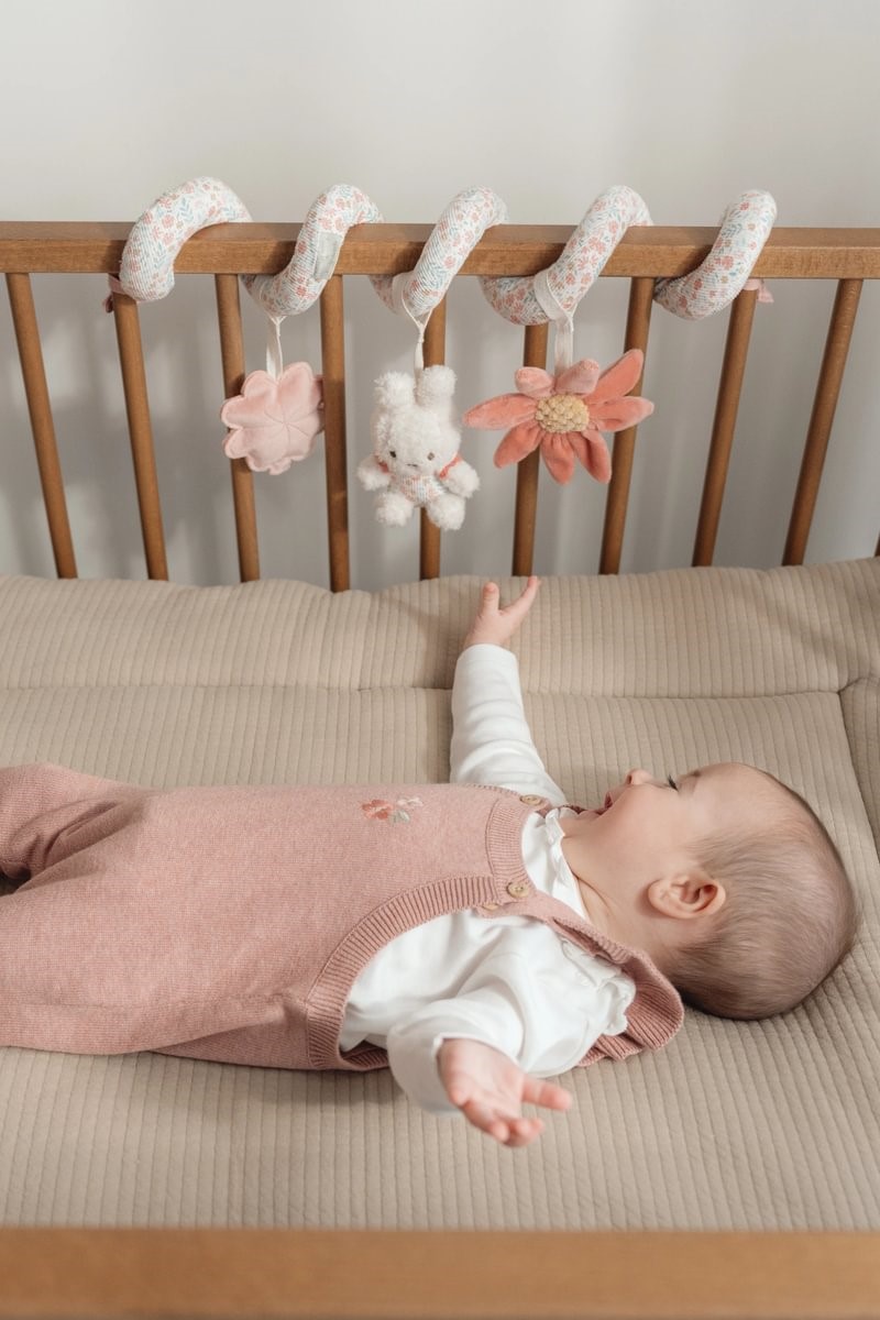 ¡Mira, siente y descubre! Esta divertida y entretenida espiral de actividades mantendrá a los bebés ocupados tanto en casa como fuera de ella. Simplemente ata este práctico juguete con las cuerdas de los extremos. Fortalece los sentidos y fomenta la coordinación mano-ojo. La espiral de actividades está hecha de pana con algodón. Adherida a la espiral está Miffy, junto con un trébol de cuatro hojas y una flor.