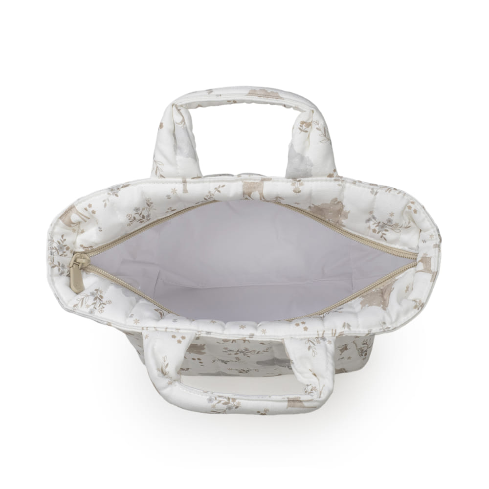 El neceser de bebé Nara de Pasito a pasito elaborado en loneta de algodón 100% con un delicado estampado de ciervos y árboles en tonos neutros, es un bolso pequeño especialmente pensado para llevar todos los productos de aseo de nuestro bebé al salir de casa. Es un modelo único con mucho estilo para adecuarse a lo que necesitas. Es un diseño bonito, simple y cómodo que ofrece un espacio pequeño pero preciso para llevar justo lo que necesitas para la higiene de tu bebé, peine, lociones y otros objetos que por ser tan pequeños a veces se pierden dentro del bolso canastilla. Cuenta con un cierre de cremallera de fácil apertura. Acabados de calidad. Está fabricado con materiales de gran calidad, libres de colorantes azoicos, ftalatos y sustancias nocivas para la salud. Además se puede lavar a mano o a máquina a temperaturas de hasta 30º. Los productos para bebé de Pasito a Pasito cuentan con un diseño muy diferente a todas las demás. Sus colecciones se caracterizan por el trabajo al detallada, pensadas siempre desde un punto de vista práctico. Utilizan materiales de primera calidad para remarcar la elegancia y la armonía en cada una de sus piezas. Nuestros modelos son exclusivos y de estilo inconfundible, pensados en madres actuales que gozan de buen gusto y que aprecian los detalles tanto como nosotros. Especificaciones: Materiales: 100% algodón / interior 100% pvc. Medidas: 30X18X14 cm.