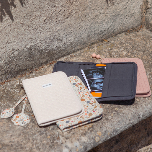 Incluye diversos bolsillos interiores para la cartilla del médico, tarjetas, libro de familia, etc.