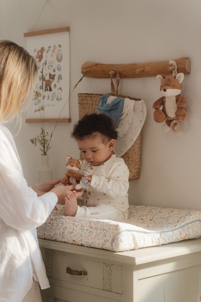 ¡Agarra, gira y sacude! El adorable zorro con su suave pelaje y su pequeña cola te invita a jugar y a poner en movimiento este sonajero. También ha elegido un pequeño hongo para que lo acaricies. El anillo transparente contiene 3 pequeñas cuentas de colores que empiezan a sonar cuando tu bebé juega con este divertido juguete. El sonajero no solo despierta la curiosidad y los sentidos de tu bebé, sino que también mejora la coordinación mano-ojo.